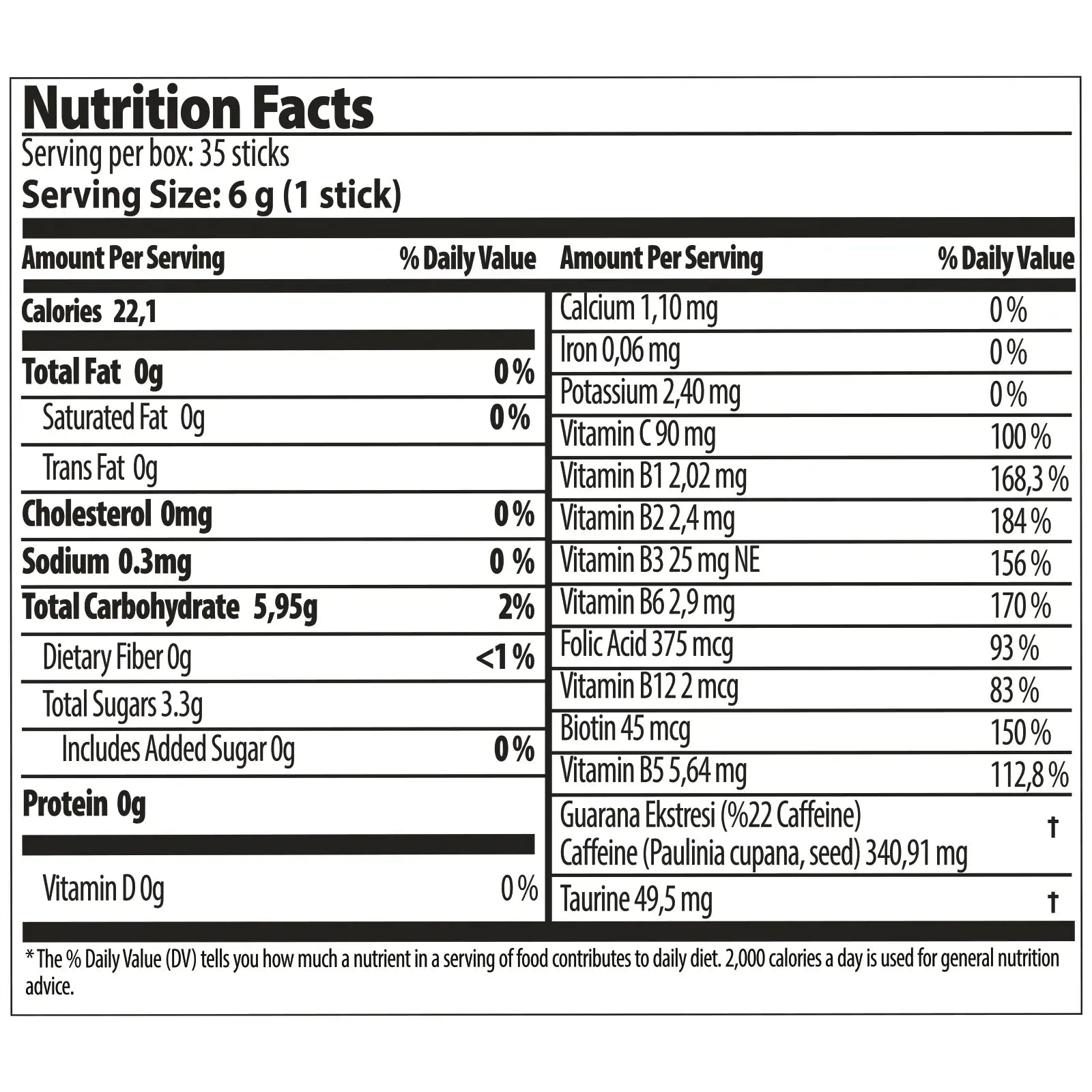 Guarana Extract, Caffeine, Taurine, Vitamin C, Vitamins B1, B2, B3, B5, B6, B12, Folic Acid, Biotin, plus auxiliary mix.